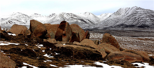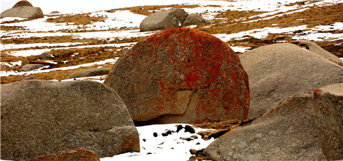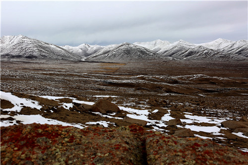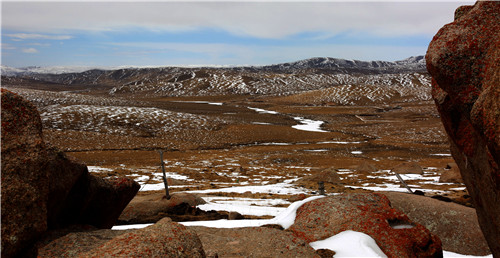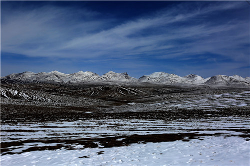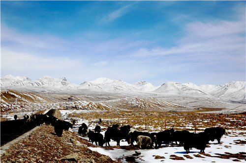 一路沿着热水路北行,映入眼帘的是,道路两旁远山和草原被冰雪分割成一道道白、一道道褐,形成了层次分明、色彩鲜艳的奇观。静静的雪山草原上一群群黑色的牦牛和白色的藏羊,在悠闲的吃草,为这片祥和的草原增添了徐徐生机。