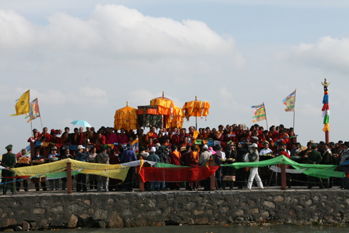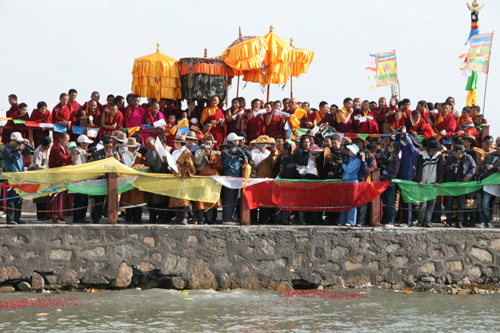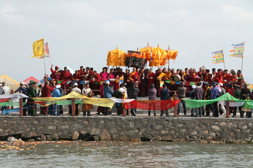 祭毕神坛,“祭海”正式开始,手执各种祭品的喇嘛与信徒们在活佛的带领下,浩浩荡荡向湖边奔去。到了湖边,先由活佛诵经作法事,众喇嘛、信徒高举着祭品簇拥在活佛身后,得到活佛指令后,大家纷纷将祭品抛向湖中,霎时湖水中浪花四溅,信徒呐喊欢呼一片。此时更有许多老人、妇女跪在湖边,摘下身上的护身符用湖水洗涤,据说这天用湖水洗护身符,可保一年平安。还有许多小伙子骑着马下湖狂奔,同样也是想获得神湖的庇佑…… “祭海”的另一项内容就是祈雨。