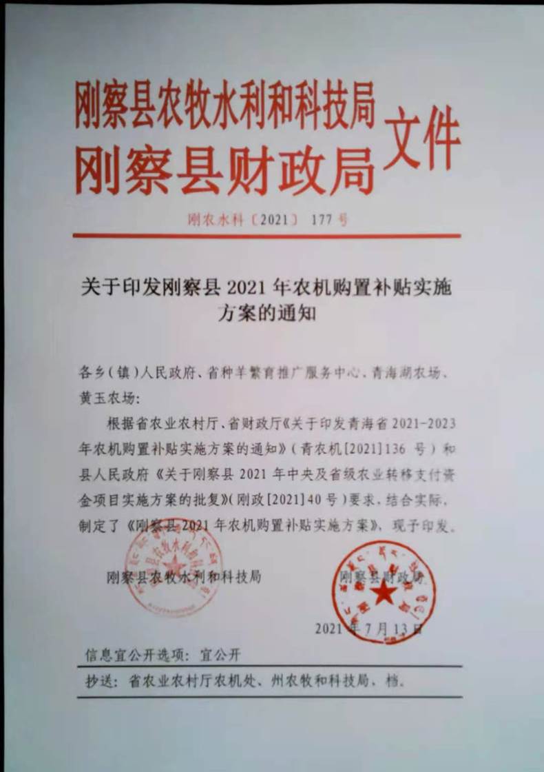 关于印发刚察县2021年农机购置补贴实施方案的通知