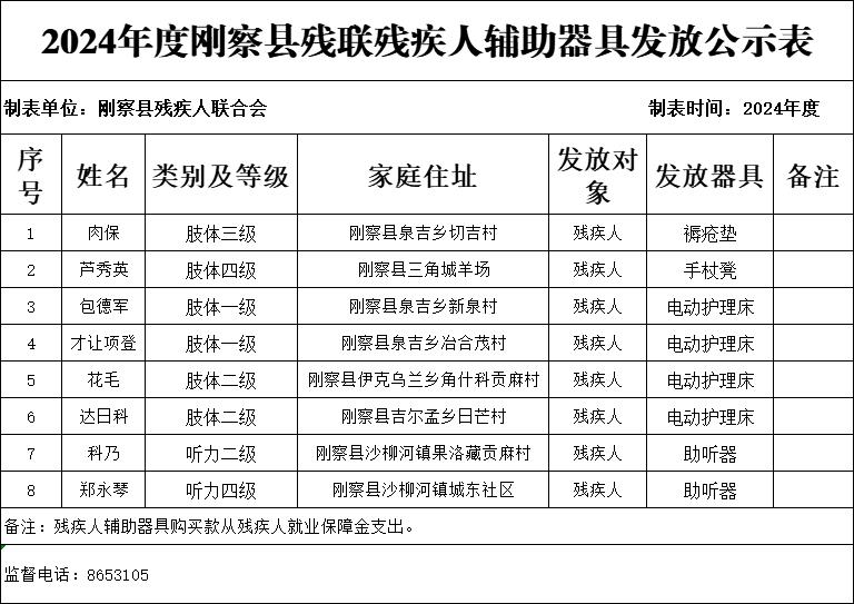 2024年度刚察县残联残疾人辅助器具发放公示表