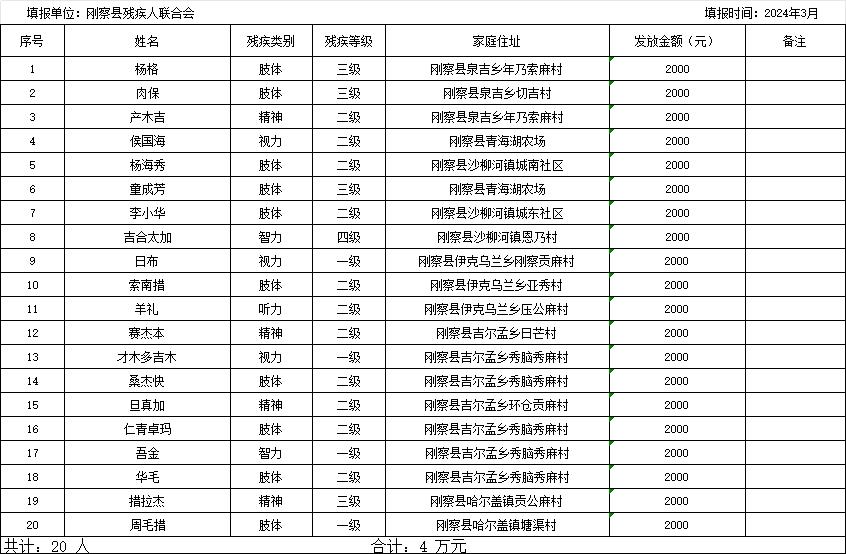 2024年度刚察县残疾人联合会困难残疾人第一批临时救助花名册