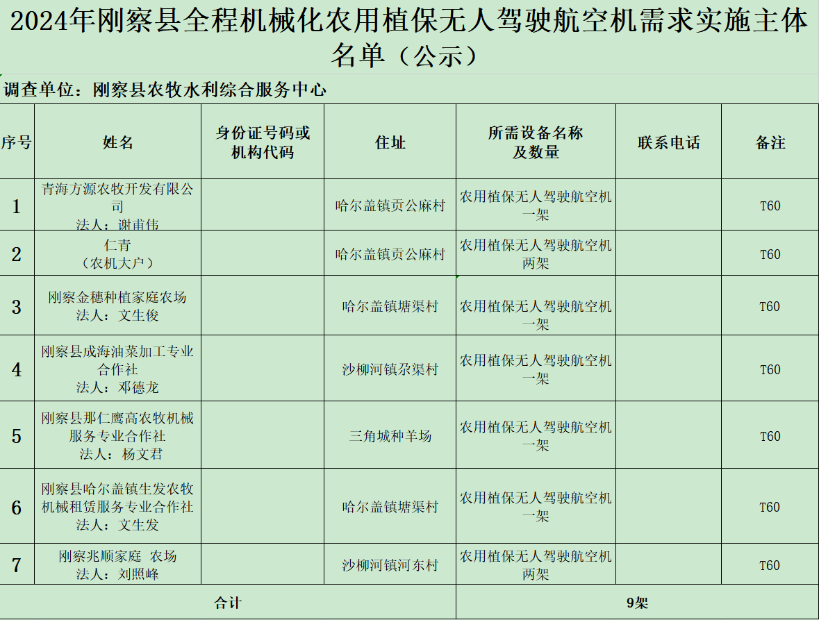 根据《2024年刚察县创建全国主要农作物生产全程机械化示范县实施方案》要求,县农牧水利综合服务中心通过进村入户调查,本着公平、公正及农户自愿申报的原则,现将2024年刚察县创建全国主要农作物生产全程机械化示范县农用植保无人驾驶航空机(T60)经营主体7家、植保高地隙自走式喷杆喷雾机(国四标准,动力100马力以上)经营主体5家需求实施主体名单公示。