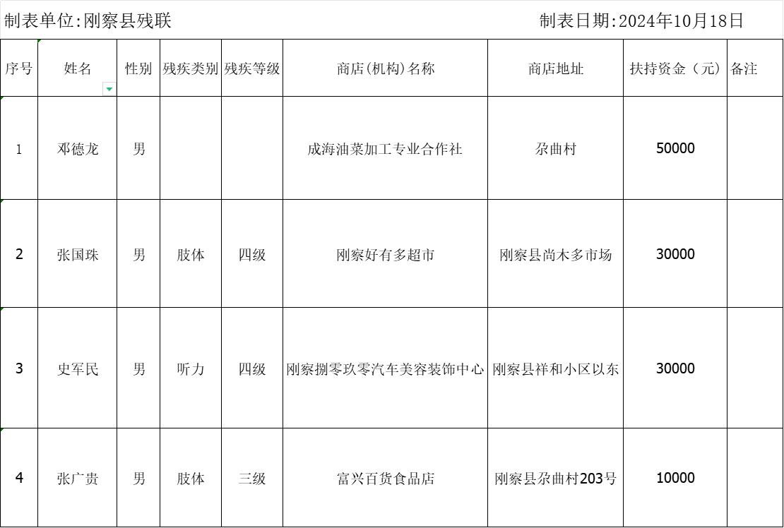 刚察县残联2024年残疾人自主就业创业扶持资金公示表