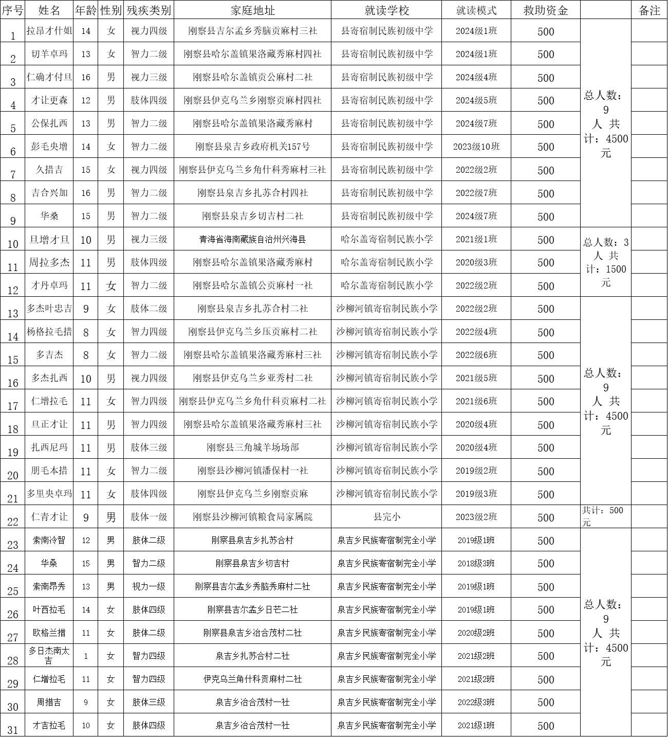2024年度刚察县残疾人联合会残疾学生(随班就读)花名册