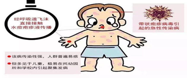 传播途径:主要经消化道或呼吸道飞沫传播,或接触病人皮肤、粘膜疱疹液而感染。