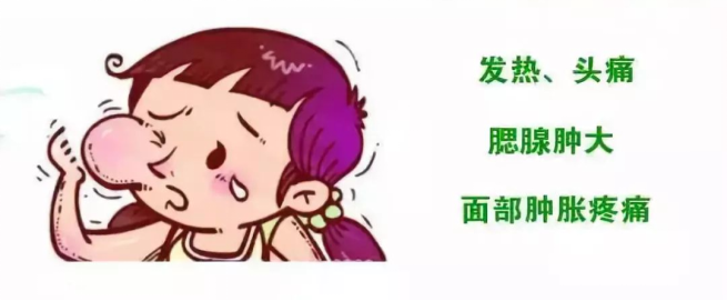 主要症状:发热、头痛、咽痛、恶心、呕吐等,数小时或1~2天开始出现腮腺肿大,多为一侧肿胀后1~4天累及对侧,肿胀多在3~5天达到高峰,7~10天逐渐消退。