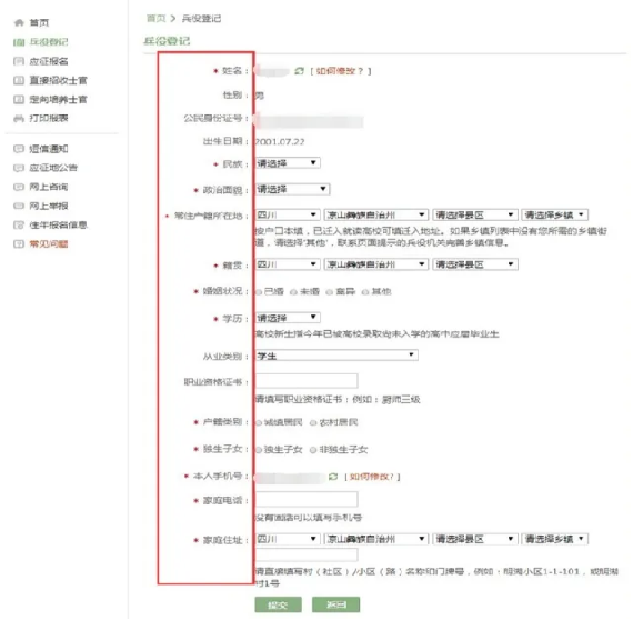 按照指示填写带*的内容,完善个人信息后点击提交,网上兵役登记就完成了。