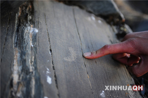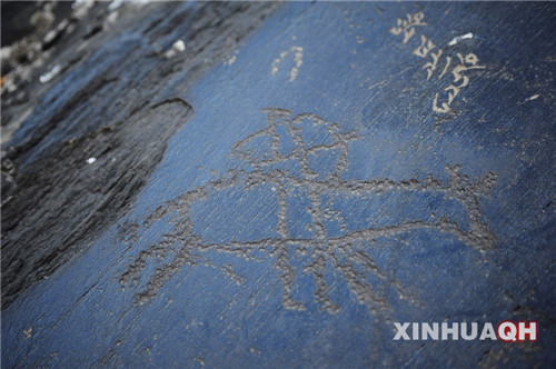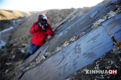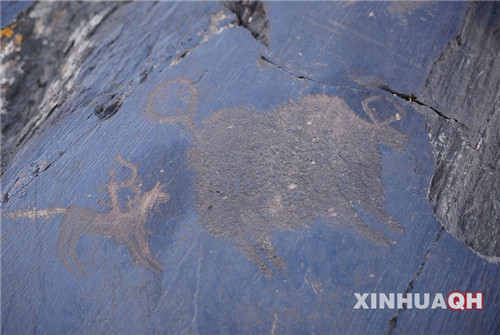 舍布齐岩画位于青海省刚察县海拔3500米左右的泉吉乡舍布齐沟的岩壁上,岩画图案有牛、羊、狼、马拉车、狩猎等。 由于岩面风蚀剥落,现仅存31幅个体形象,这些图案采用垂直打击点刻方法,个别的为阴刻线雕方法,其时代据初步研究暂定在南北朝至唐代。据了解,舍布齐岩画现为青海省省级文物保护单位。新华社发(李少鹏摄)