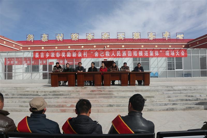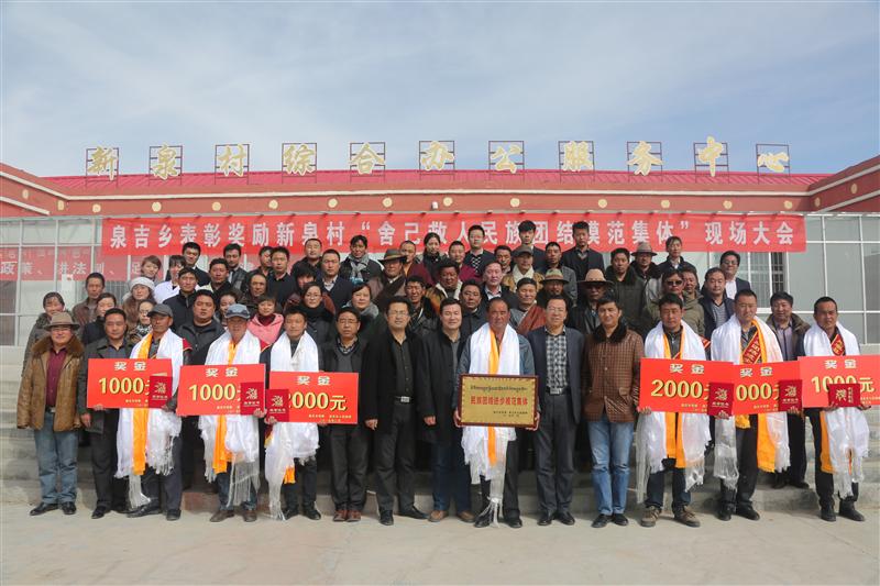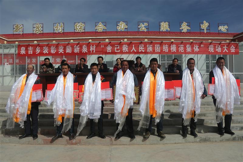 3月24日,泉吉乡党委、政府,各村“两委”会全体成员、寺管会负责人、乡属各单位以及新泉村全体村民共计400余人以隆重集会形式,在新泉村文化活动广场召开新泉村“舍己救人民族团结进步模范集体”表彰奖励大会。