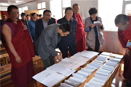 观摩团领导及成员在哈尔盖镇环仓秀麻寺观摩。图为观摩团成员查阅档案资料。