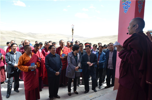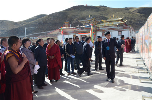 观摩团领导及成员在伊克乌兰乡角什科寺观摩。图为观摩团成员听取工作介绍。