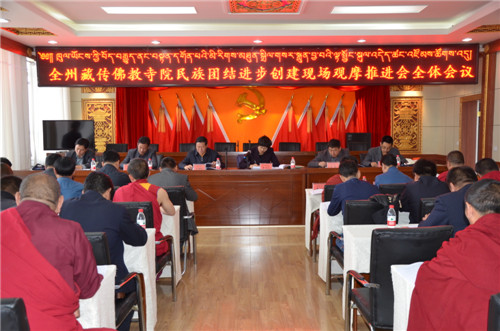 观摩团一行先后深入我县哈尔盖镇环仓秀麻寺、伊克乌兰角什科寺及刚察大寺观摩了民族团结进步创建工作开展情况,听取了各寺院有关创建民族团结进步示范寺院的工作情况的介绍,观摩团全体成员对我县宗教寺院开展民族团结进步创建工作给予了充分肯定和高度评价。最后,在沙柳河镇会议室召开了全州藏传佛教寺院民族团结进步创建现场观摩推进会全体会议。会上刚察县统战部部长切加就我县宗教寺院民族团结进步创建工作开展情况做了详细汇报。随后,刚察大寺、阿柔大寺、仙米寺、白佛寺民管会主任在会上分别作了交流发言。州佛教协会会长才福旦做了重要讲话,指出:刚察县藏传佛教寺院在开展民族团结进步创建活动方面做了大量扎实有效的工作,取得了明显的成效。同时,他要求各相关单位继续加大工作力度,落实好省州各项工作,进一步深化平安寺院建设、寺院“三比一促” 和宣传教育“六进寺院”工作,迎接五月份国家验收。最后,州委统战部常务副部长李旭贞做了总结讲话,并对下一步各项工作作出了具体安排,我州各县要在下一步工作中突出重点,创新机制,切实加强对新时期、新宗教工作中的问题的研究,把强化宣传教育,提高宗教人员素质作为基础性工作来抓,形成浓厚的舆论和教育氛围。同时,我州各县要按照刚察县民族团结进步示范寺院、藏传佛教寺院星级评定、宗教寺院“三比一促”活动考核验收的标准,认真组织“回头看”,查漏补缺,进一步巩固创建成果,切实抓好落实,集中精力打好迎“国检”攻坚战,不断开创全州宗教工作新局面。