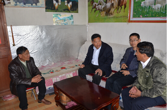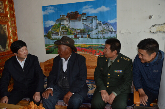 图为县委书记拉科一行慰问老党员、卸任村干部龙什多。