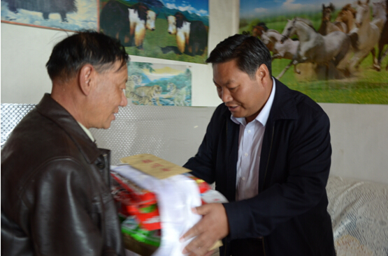 在伊克乌兰乡亚秀村老党员多日巴家中,县委副书记、县政府县长晁世海手捧洁白的哈达向老人送上了节日的祝福,与老人促膝交谈,详细询问了老人的生活起居及身体状况,并叮嘱随行的相关人员及时帮助解决日常生活中遇到的问题与困难,让他们感受到党和政府的关爱。还向多日巴老人提出了殷切希望,希望你们时刻关注刚察的经济发展和各项建设,发挥余热作用,为建设和谐新刚察多建言献策。最后,晁世海县长为多日巴老人送去了慰问金和慰问品。