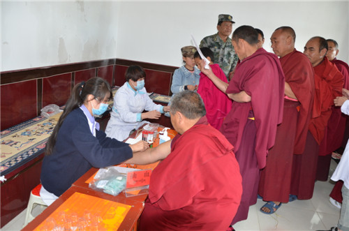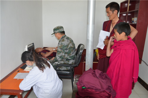 为加强“四库”建设,切实解决广大僧侣的身体健康和联系服务“最后一公里”的问题。7月17日至18日,海北军分区肖汉副司令员带队,解放军第四陆军医院副院长何敏带领五科主任专家来刚察免费为刚察大寺、刚察小寺、赛日德寺的活佛僧侣们免费体检义诊,县人武部政委杨兴元及县委统战部相关负责人陪同。专家们分别从肝功化验、尿常规、心电图、B超等项目进行体检,并设有五官科、眼科、消化科、外科、内科、皮肤科等科的专家,免费现场为活佛僧侣们诊断,妇科专家的大夫免费为寺院就近的妇女们进行妇科疾病的检查。