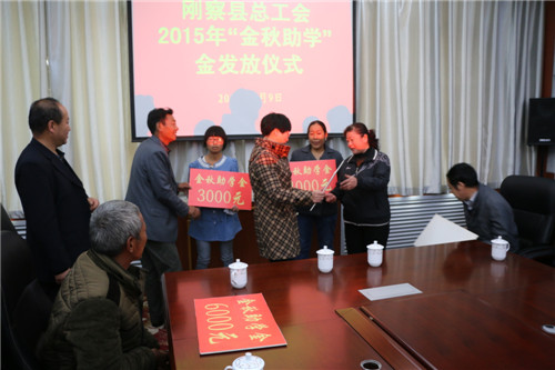 金秋助学,为贫困学子圆求学梦。刚察县总工会于9月9日举行了2015年度“金秋助学”金发放仪式。县政协副主席韦志起、县政府督学周毛应邀参加发放仪式。本次共为全县71名考上大学的困难职工、城镇居民子女发放了18.6万元的助学金。其中一本每人资助6000元、二本、三本每人资助4000元、大专每人资助3000元、往届生每人资助2000元。