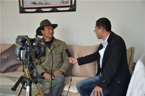 图为县广播电视台记者采访才保。