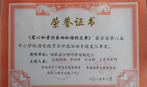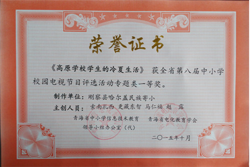 11月份,青海省第八届校园电视评选结果揭晓,经青海省电化教育学会评审,我县选送的5件中小学校园电视作品中有2件获奖,其中哈尔盖寄校选送的《高原学校学生的冷夏生活》获得全州乃至全省专题类一等奖。这也是我县自参加此项活动以来获得的最高殊荣。另外,沙柳河寄校选送的《爱心和责任奏响和谐乐章》获得专题类三等奖。