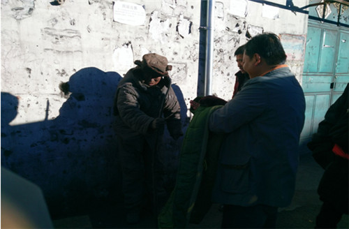 县民政局工作人员为流浪乞讨人员送去了棉大衣