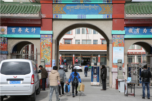 图为县民族寄宿制初级中学学生走进校园。