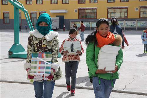 图为沙柳河民族寄宿制完小学生搬课本。