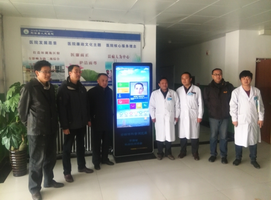 图为工作人员为县医院安装全媒体科普阅览屏。