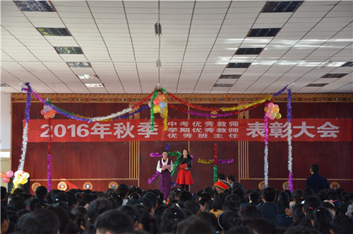 表彰大会上,校党支部专职副书记杨建忠宣读表彰决定,校党支部书记、校长增卡作重要讲话,首先她代表学校向辛勤耕耘在教育教学一线的老师们表示崇高的敬意,并对今天受到表彰的优秀教师表示祝贺,希望全体教师不断加强师德修养和学识修养,牢记一名教师的职责和使命,弘扬爱岗敬业的精神,做学生成长路上的引路人和陪伴者。会上表彰了16名年终考评优秀教师、10名优秀班主任和15名中考成绩优秀教师,学校全体领导班子成员为受表彰的优秀教师颁奖,学生代表给优秀教师、优秀班主任送上了鲜花。