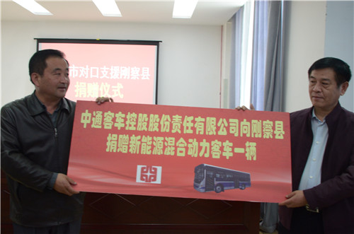 刚察县委副书记陈永祥交接捐赠的新能源混合动力客车