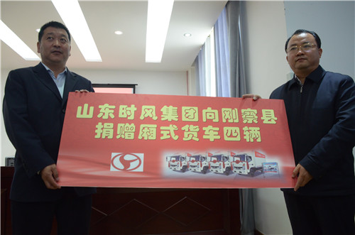 时风集团董事长刘成强与刚察县政府副县长巴特交接捐赠的厢式货车