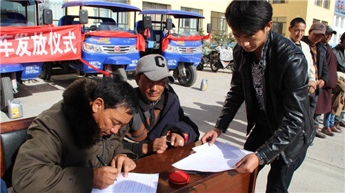 仪式现场,为确保“扶贫农用车”发放公平有序,村委会依次与贫困户签定了相关协议,要求贫困户要精心养护并合理使用自己的农运车,禁止出售他人,要正确认识农运车运输产业扶贫项目,纳入产业化链条中,让“扶贫农用车”真正变成“致富农用车”。受助贫困群众依次接过通向致富大门的“金钥匙”,感激之情溢于言表,纷纷表示会通过自身劳动,增加收入,尽快脱贫致富。