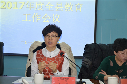 她指出:2016年,全县教育工作在县委、县政府的正确领导下,在社会各界的大力支持下,呈现出“突出项目抓投入,办学条件逐步改善;突出短板抓突破,学校管理不断规范;突出管理抓提升,师资建设不断加强;突出服务抓保障,惠民政策有效落实;突出改革抓创新,教研能力不断提升。”五大亮点。并从教育水平的差距、教育发展现状、控辍保学、评价体系建设等方面深入分析了我县教育教学工作存在的突出问题。从重视程度、政策机遇、发展基础三个方面阐述了刚察教育发展面临的新机遇。