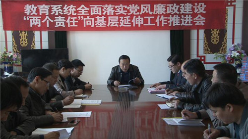 在落实党风廉政建设“两个责任”向基层延伸方面,李秀局长要求,一要落实“两个责任”,强化“一岗双责”,深入推进党风廉政建设。党风廉政建设关系到全县教育的改革发展稳定大局,必须使每一位教育行政干部自觉肩负起“一岗双责”的使命,以踏石留印的劲头持之以恒地 抓好党风廉政建设。二要践行法律法规,强化刚性约束,全面加强党的纪律建设。认真学习贯彻《关于新形势下党内政治生活的若干准则》和《中国共产党党内监督条例》,把纪律建设摆在更加突出的位置,加强党性党风党纪教育。三要善于动真碰硬,强化执纪问责,切实改进作风效能建设。继续紧紧扭住“四风”突出问题,做到监督不松劲、检查不停顿、问责不手软,始终保持有力震慑,努力形成作风建设新常态。四要培育精品工程,强化廉政教育,积极实施廉政文化建设。坚持遵纪守法和崇德重礼相结合,大力弘扬优秀传统文化,深入推进教育系统廉政文化建设,以优良的党风政风带动校风教风学风。五要提升师德水平,强化专项整治,认真抓好政风行风建设。继续狠抓教育政风行风建设,内强素质,外树形象,进一步提高人民群众对教育工作的满意度。