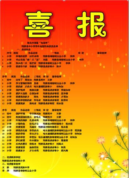 为促进中小学信息技术教育工作,普及信息技术知识,丰富学生学习生活,激发创新精神,培养实践能力,根据中央电化教育馆《关于组织参加第十八届全国中小学电脑制作活动的通知》文件精神,我县组织全县中小学参加了海北州首届“电信杯”中小学学生电脑作品评选活动。