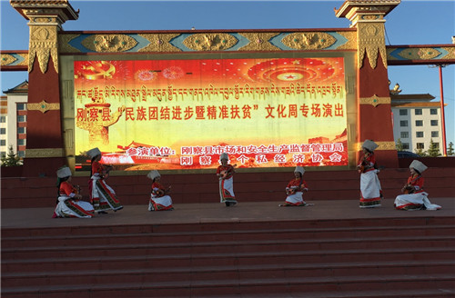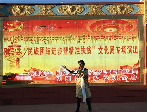 七月,一个骄阳似火的季节,一个充满热情与阳光的月份。七月的刚察大地绿草如茵,百花齐放,百鸟飞翔,随风起伏的草原如同碧波汹涌的绿色海洋,幽幽的草香迎面拂来,夕阳西下,为辽阔的草原镀上一层金色。今夜,由刚察县市场和安全生产监督管理局联合刚察县个私经济协会在刚察县文化活动广场举行的“民族团结进步暨精准扶贫”文化周专场演出火热开幕。
