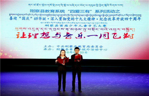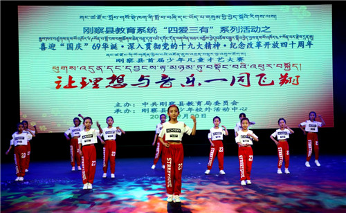 为深入贯彻落实习近平新时代中国特色社会主义思想、党的十九大和习近平总书记关于文化艺术工作讲话精神,传承和弘扬中华文化艺术,丰富校校内外文化生活,全面提升青少年儿童的艺术素养。9月20日,由刚察县教育局党委主办、青少年校外活动中心承办了以“喜迎“国庆”69华诞·深入贯彻党的十九大精神·庆祝改革开放四十周年”为主题的少年儿童才艺大赛。