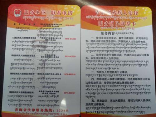 为搭建残疾人办事绿色通道,听取残疾人呼声,为残疾人解疑释惑,真正实现残疾人办事无障碍;近日,刚察县残联将1000余张残疾人法律服务便民联系卡发放到全县5 个乡镇和31个行政村及4个社区共计1000余残疾人手中,同时在残联办证大厅窗口对每一位前来办证的残疾人进行发放。便民联系卡上注明法律服务热线电话、单位地址、办公室电话以及法律服务内容等。