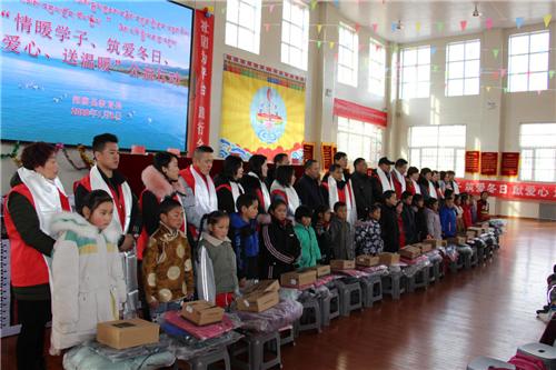 发放仪式上,爱心志愿者服务队为县民族寄宿制初级中学、沙柳河镇民族寄宿制完全小学、泉吉乡民族寄宿制完全小学和哈尔盖民族寄宿制完全小学4所学校80名贫困学生捐赠了价值5.3万元物资(每名学生一件羽绒服,一双雪地靴,一个书包)。爱心企业代表、受助学生代表分别作了发言。