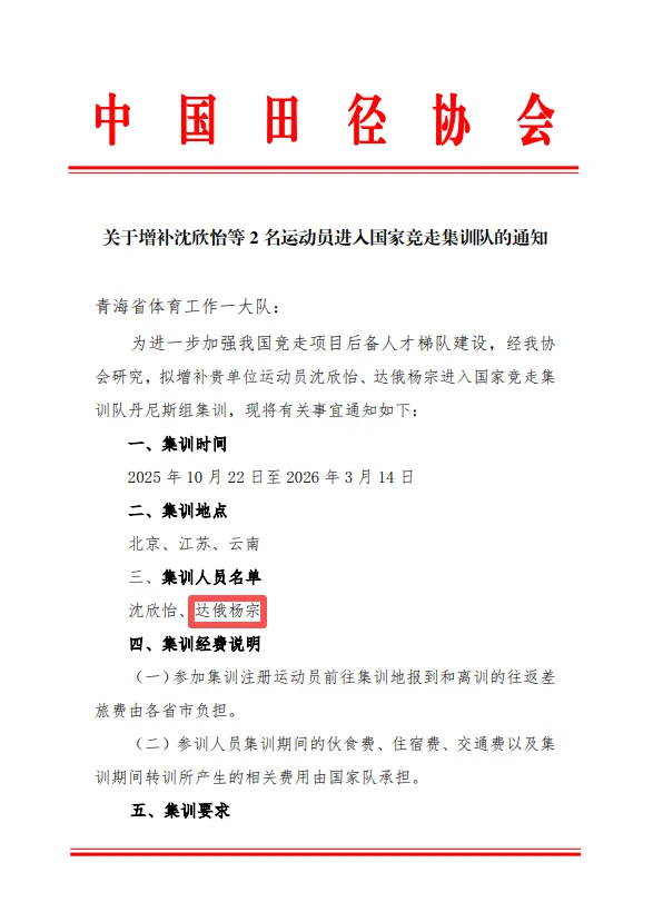 根据中国田径协会安排,本次集训自2025年10月22日开始,至2026年3月14日结束,期间将辗转北京、江苏、云南等多地开展系统训练,旨在强化我国竞走项目人才储备。期待达俄杨宗在国家集训队的平台上,以扎实训练提升实力,以突破自我追逐梦想,未来能代表海北、代表青海、代表中国,在国内外竞走赛场上绽放青春光彩,书写运动华章!