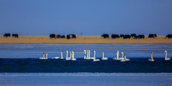 封冻后的青海湖并未陷入沉寂,反而成为生灵栖息的乐园。刚察县仙女湾、四季天鹅湖等核心区域,已是大天鹅越冬的天堂。洁白的生灵或展翅掠过冰面,或悠然栖息于湖畔,与银装素裹的冰雪世界相映成趣,构成一幅灵动鲜活的高原生态画卷。