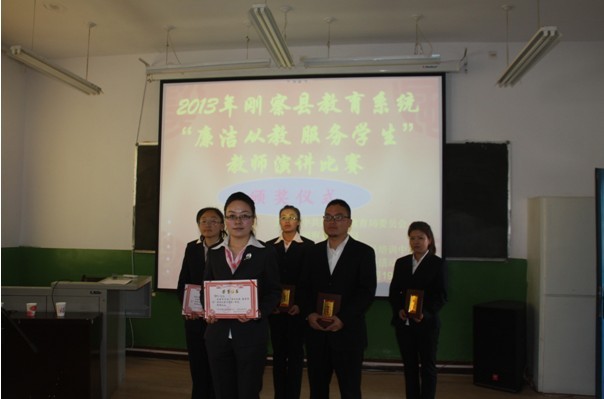 最后,县教育局领导为在此次演讲比赛中成绩突出的6名教师和三所学校分别颁发了荣誉证书和锦旗。