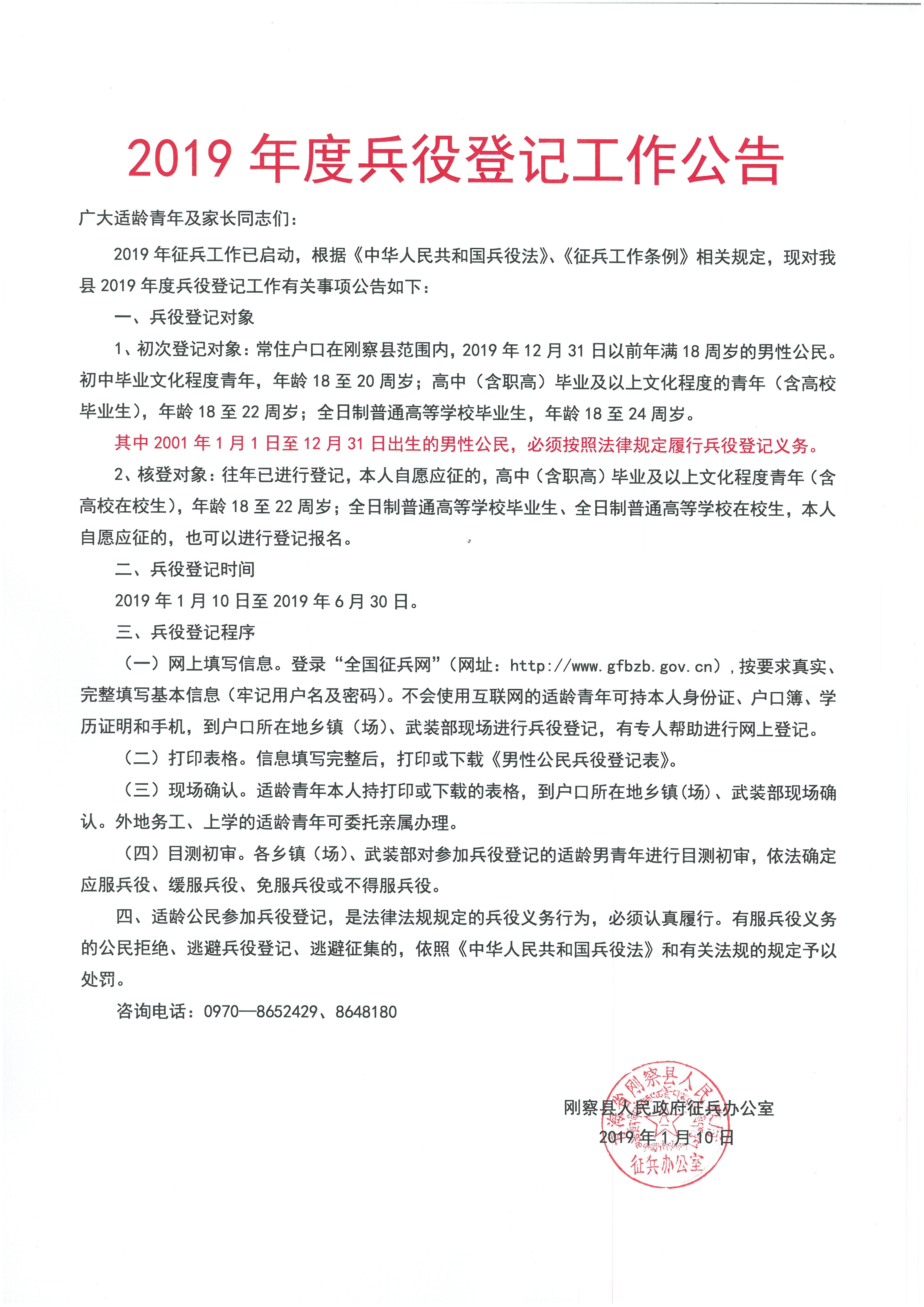 2019年度兵役登记工作公告