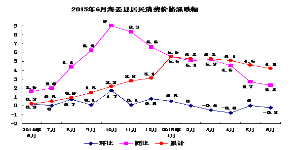 (七)居民消费价格继续回落。6月份,省定监测点海晏县居民消费价格总水平(CPI)环比下降0.2%、比全省平均水平低0.1个百分点;同比上涨2.3%、比全省平均水平低0.5个百分点。上半年,累计上涨4.2%、比全省平均水平高1.3个百分点、比1-5月回落0.4个百分点。被调查的八大类居民消费价格总水平累计呈现“五类涨幅较高、三类略有上涨”,其中:居住、食品、家庭设备用品及维修服务、娱乐教育文化用品及服务、衣着、医疗保健及个人用品、交通通信和烟酒八类价格分别上涨10.4%、4.6%、4.5%、3.6%、3.5%、0.6%、0.5%和0.4%。