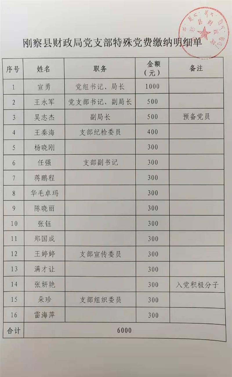 自疫情发生以来,刚察县财政局党组坚决落实疫情防控各项决策部署,关键时刻冲锋在前,发挥战斗堡垒的作用。全体党员干部怀抱回报社会的感恩理念,紧紧树立相信党、依靠党、齐心协力、攻坚克难的必胜信心,积极投入到新型冠状病毒感染的肺炎疫情防控工作。2月4日,财政局支部发出开展抗击新型冠状病毒感染的肺炎疫情自愿交纳“特殊党费”的倡议,短短1个小时,收到支部14名党员和1名预备党员、1名入党积极分子共计交纳“特殊党费”6000元。