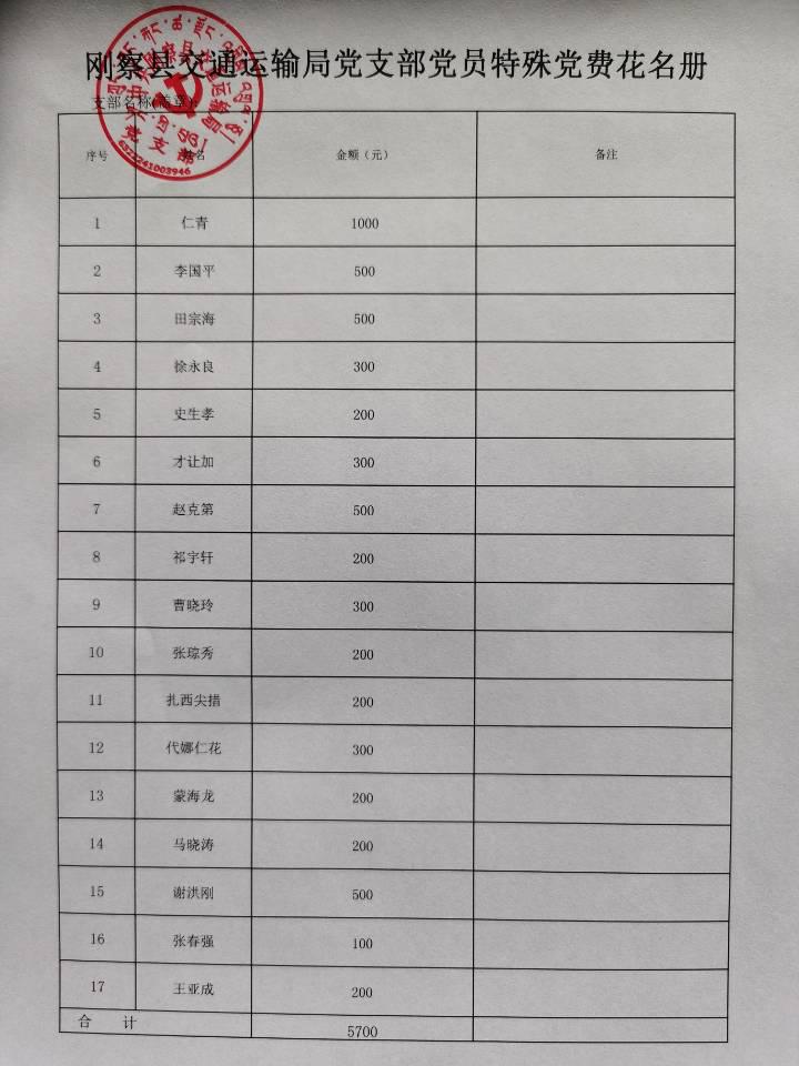 为打赢抗击新型冠状病毒感染的肺炎疫情防控攻坚战,我交通运输局党支部宣传发动,向大党员致全局党员干部的倡议,充分发挥基层党组织战斗堡垒作用和党建工作引领作用,广大党员坚守初心、担当使命、迎难而上、主动作为,用实际行动支持抗击疫情。自防疫工作开展以来,刚察县交通运输支部全体党员牢记使命、勇于担当、全身心投入到新型冠状病毒性肺炎疫情防控工作。2月4日交通运输支部向全体党员发出倡议,开展抗击新型冠状病毒感染的肺炎疫情自愿交纳“特殊党费”活动,在倡议发出后的短短2个小时里,共收到支部17名党员交纳“特殊党费”5700元,目前,支部已将全部“特殊党费”上缴县委组织部用于疫情救助。