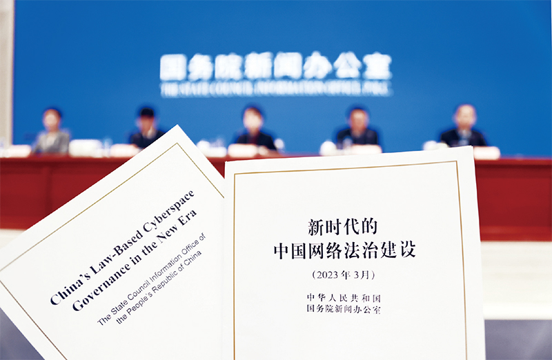 2023年3月16日,国务院新闻办公室在北京发布《新时代的中国网络法治建设》白皮书,并举行新闻发布会。图为当日拍摄的白皮书。 新华社记者 潘旭/摄
