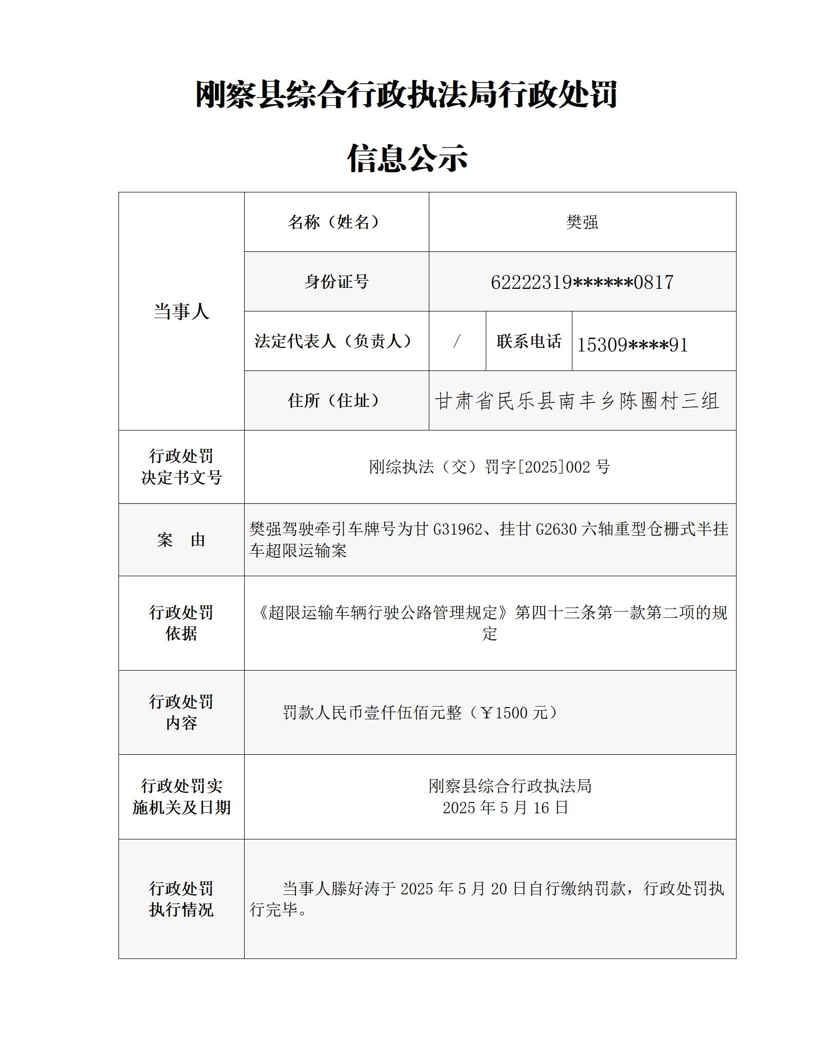 刚察县综合行政执法局行政处罚信息公示