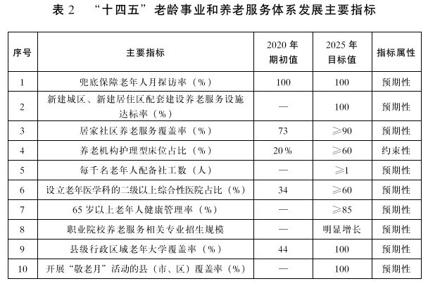 (三)发展目标。到2025年,实施积极应对人口老龄化国家战略的政策制度体系进一步完善,基础设施布局进一步优化,老年健康服务能力进一步提升,人才队伍建设进一步加强,质量监管机制进一步强化,产业要素市场进一步拓展,社会支持体系进一步健全,基本建成具有青海特点的居家社区机构相协调、医养康养相结合的养老服务体系,全社会积极应对人口老龄化格局初步形成,老年人获得感、幸福感、安全感持续增强。到2035年,城乡一体化养老服务体系全面形成,支付保障能力显著提升,养老服务产业发展更具活力,具有青海特点的老龄事业和养老服务体系成熟定型,实现养老服务均等化。