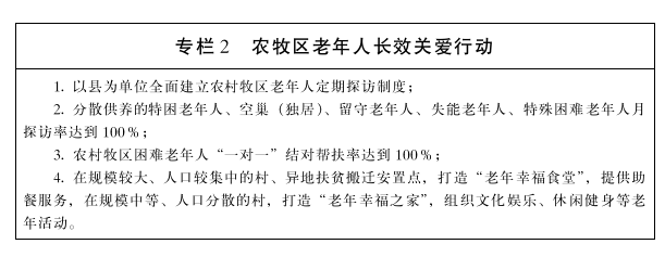 3.开展农牧区老年人长效关爱行动。人口较集中的村,可探索“集中助餐”服务模式,为农村独居、留守、孤寡等老年人开展集中助餐服务,打造“老年幸福食堂”。人口分散的村,可定期组织文化娱乐、休闲健身等老年活动,打造“老年幸福之家”。鼓励有条件的地区,组织专业服务队伍,上门为老年人提供巡回流动助洁、助浴、助医、助餐、助行、助急等服务。对生活不能自理兜底保障对象建立信息档案,加强精细化管理服务,定期组织开展核查工作,推动应保尽保、救助补贴到位。对其他高龄、独居、留守、失能、残疾社会老年人,实行“网格化”结对帮扶,定期上门巡访探视,提供家政保洁、精神慰藉、救助救援等基础服务。