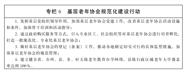 3.鼓励老年人社会参与。在全社会倡导积极老龄化的思想观念,引导老年人根据自身情况,积极参与家庭、社区和社会发展。积极开展“银龄行动”,支持老年人参与公益慈善、科教文卫等事业,鼓励专业技术领域人才参与志愿服务,发挥专长。鼓励和引导老年人在城乡社区建立基层老年协会等社会组织,搭建自我服务、自我管理、自我教育平台。指导和促进基层老年社会组织规范化建设。建设高层次老年人才智库,在调查研究、咨询参谋、建言资政等方面发挥作用。