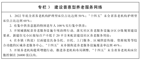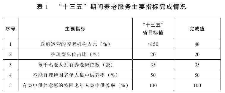 (一)“十三五”时期主要成就。“十三五”期间,我省各级党委和政府积极贯彻落实党中央、国务院关于积极应对人口老龄化战略部署,加快推进“健康青海”建设,老龄事业和养老服务工作得到全面发展,“十三五”期间设立的老龄事业和养老服务主要发展指标基本实现。一是老龄政策体系不断健全。围绕积极应对人口老龄化、推进养老服务领域“放管服”改革、优化发展环境、提高服务质量等方面出台了一系列政策措施,涉老政策不断细化完善,基本形成了覆盖城乡的养老服务政策体系。二是基础设施建设成效显著。筹集资金约20.2亿元,组织实施了826个养老基础设施新建、改扩建项目,新增、改建床位11427张,养老床位数达到24508张,实现了县级行政区域养老服务设施全覆盖。三是兜底养老服务不断完善。持续加强特困人员保障,推进公办养老机构改革,改造提升特困人员供养服务设施,确保有意愿的特困人员全部实现集中供养。筹集资金7.8亿元,以政府购买服务的方式为全省10.3万名经济困难、高龄老年人提供了基本养老服务补贴。四是养老服务质量有效提升。开展养老机构质量建设专项行动和特困人员供养服务设施改造提升工程,养老机构普遍存在的安全隐患得到有效遏制和及时处置,养老机构护理型床位占比由“十二五”末的5%增长到20%,养老机构服务质量普遍改善。西宁市、海东市、海北州、海西州先后纳入国家级居家社区养老服务改革试点地区,西宁市获评为“全国居家社区养老服务改革试点优秀地区”,并被国务院通报表扬。五是医养康养不断融合发展。老年人健康水平持续提升,老年健康科学知识广泛普及,65岁以上老年人享受免费健康体检和健康管理服务,189个医疗机构与养老机构签订协议建立合作关系,医养结合服务有序发展,照护能力明显提升。六是老年友好型社会环境建设扎实推进。大力发展老年文化、教育、体育事业,丰富老年人精神文化生活,积极搭建老有所为平台,健全完善老年法律服务网络,老年人社会参与渠道更加畅通,合法权益得到有效保障。